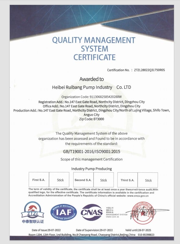 International quality management system, CE certified, ISO 9001:2015 certified. National mandatory mining mark certification. National explosion-proof qualification certification. Furthermore, Ruibang Pump Industry has established a multi-functional physical and chemical laboratory for continuous quality monitoring, equipped with a spectrometer, portable spectrometer (PMI), material testing machine, impact testing machine, hardness tester, tensile testing machine, thickness gauge, magnetic particle flaw detector, etc.